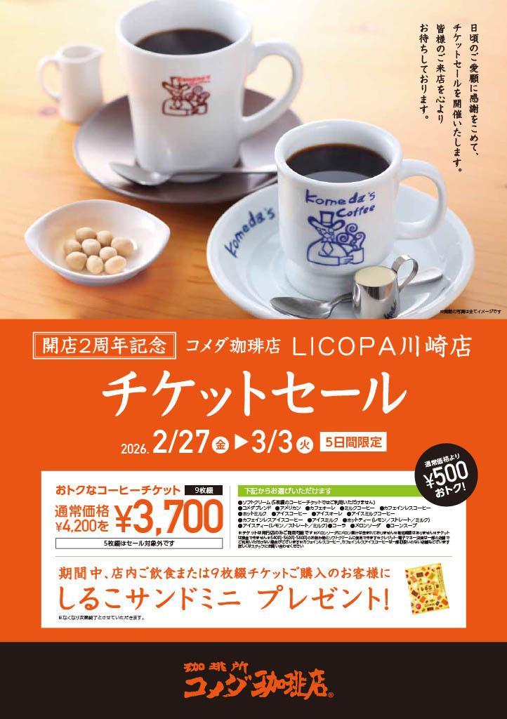 【2月27日(金)~3月3日(火)】コメダ珈琲店LICOPA川崎店 開店2周年記念キャンペーン!